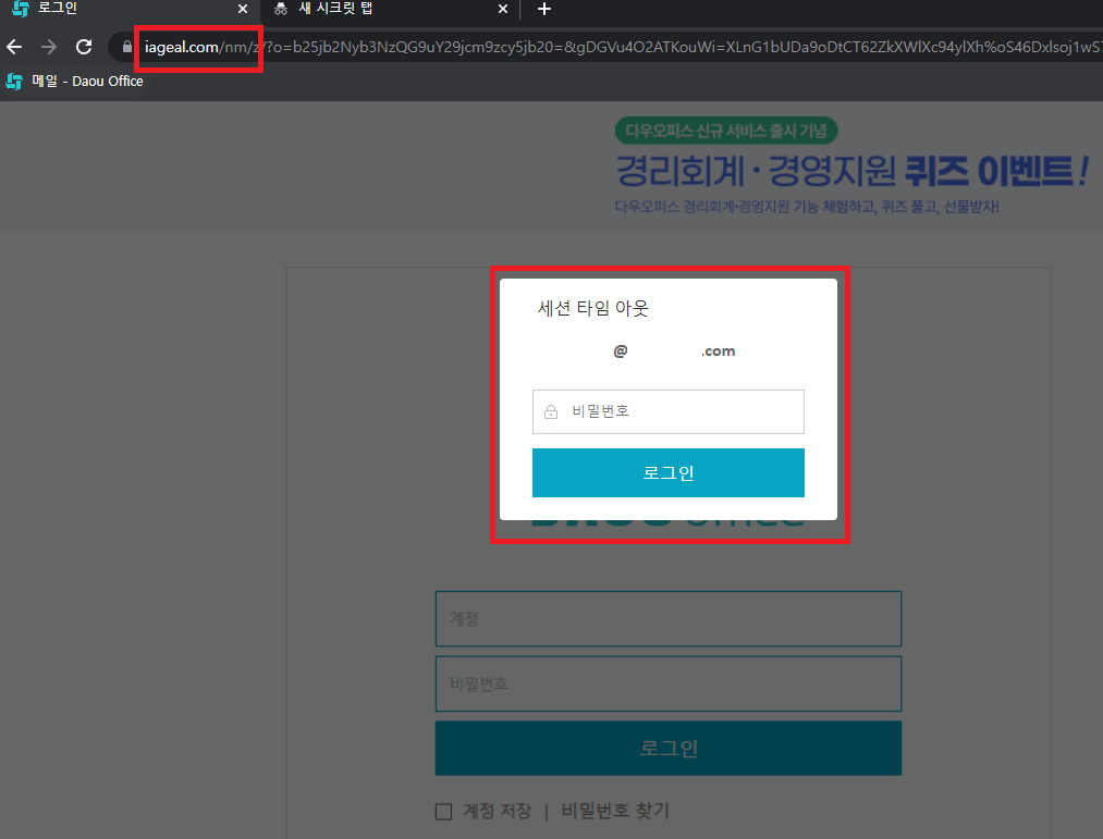 최근 다우오피스 그룹웨어 서비스를 사칭한 메일계정 탈취 피싱사이트가 신고되고 있습니다.