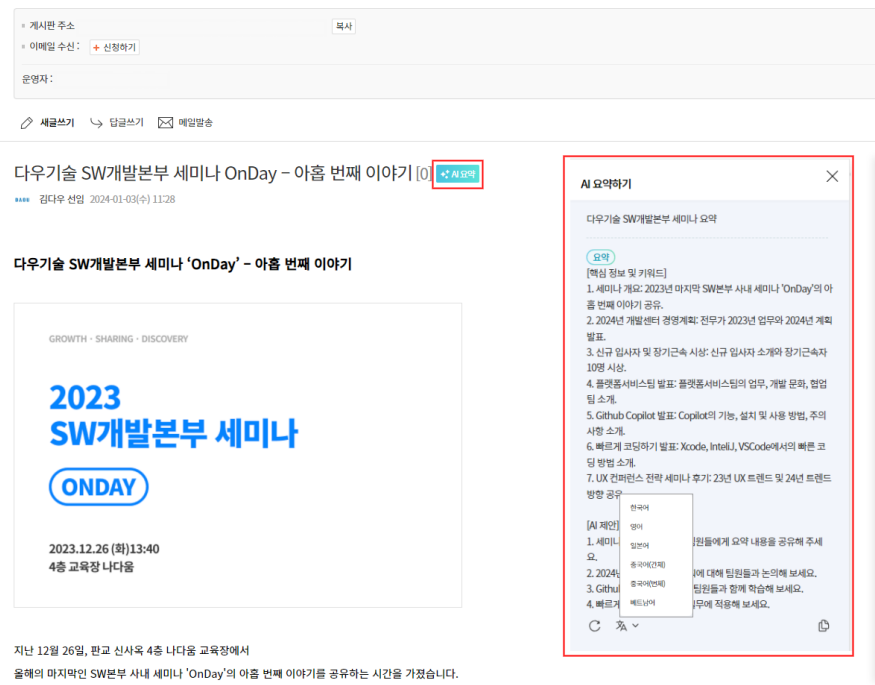 게시글 상세페이지에서 버튼을 클릭하여 요약내용을 확인합니다.