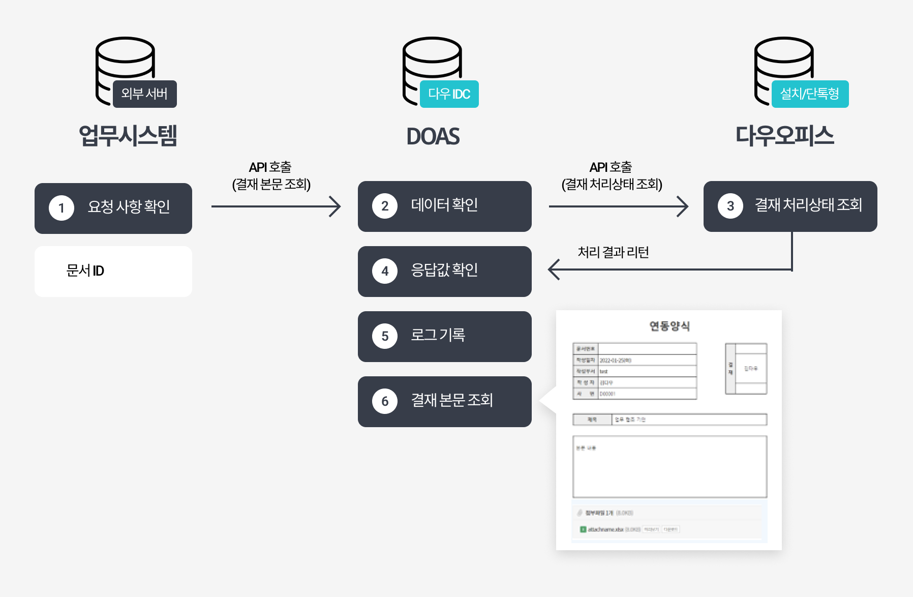 | DocumentId | String | Y | N | 다우오피스 전자결재 고유 식별코드 / 문서ID ※ 다우오피스 전자결재 상신 완료 시 업무시스템으로 전달정보 (docId) |