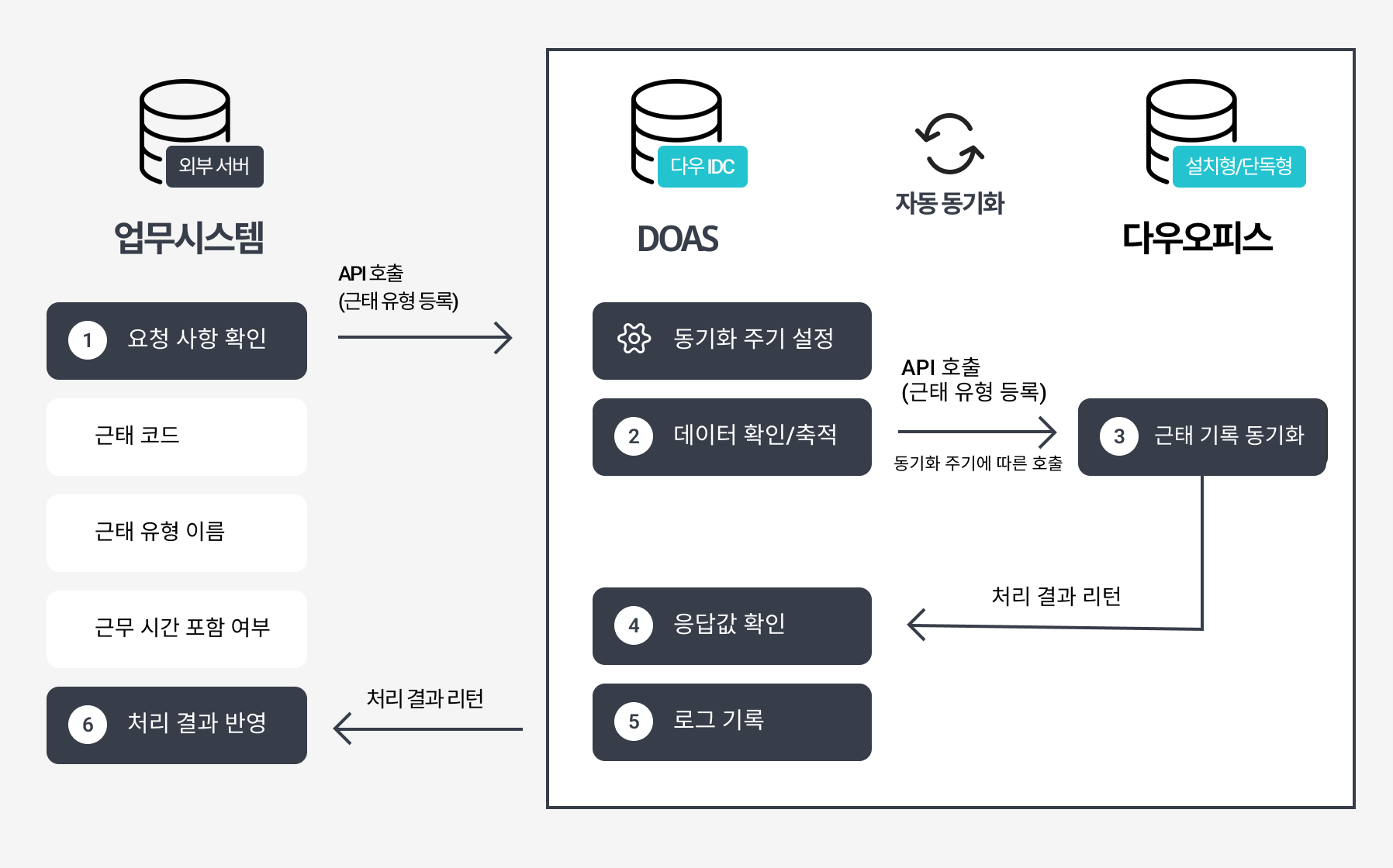 다우오피스 OpenAPI 서비스의 근태 유형 연동을 위한 <근태 유형 등록 API> 입니다. 연동된 근태 유형은 DOAS(DaouOffice API System)의 중간 DB에 저장된 후 자체적인 동기화 주기 설정에 따라 다우오피스에 연동됩니다. 근태코드(timelineCode)가 중복으로 API 호출되는 경우 최종 덮어쓰기 방식으로 DOAS 중간 DB에 저장되며, 최종으로 저장된 중간DB 내용이 동기화 됩니다.