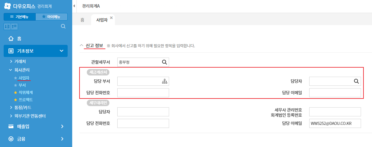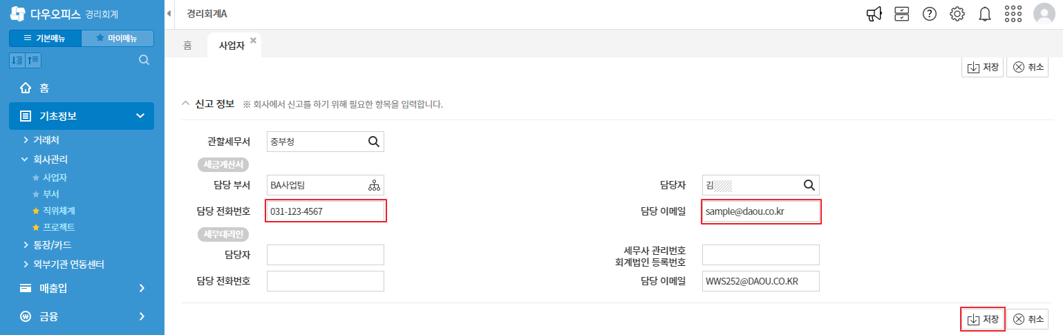 - 담당자의 전화번호 및 이메일을 입력하고 세금계산서 정보 확인 후 저장합니다.