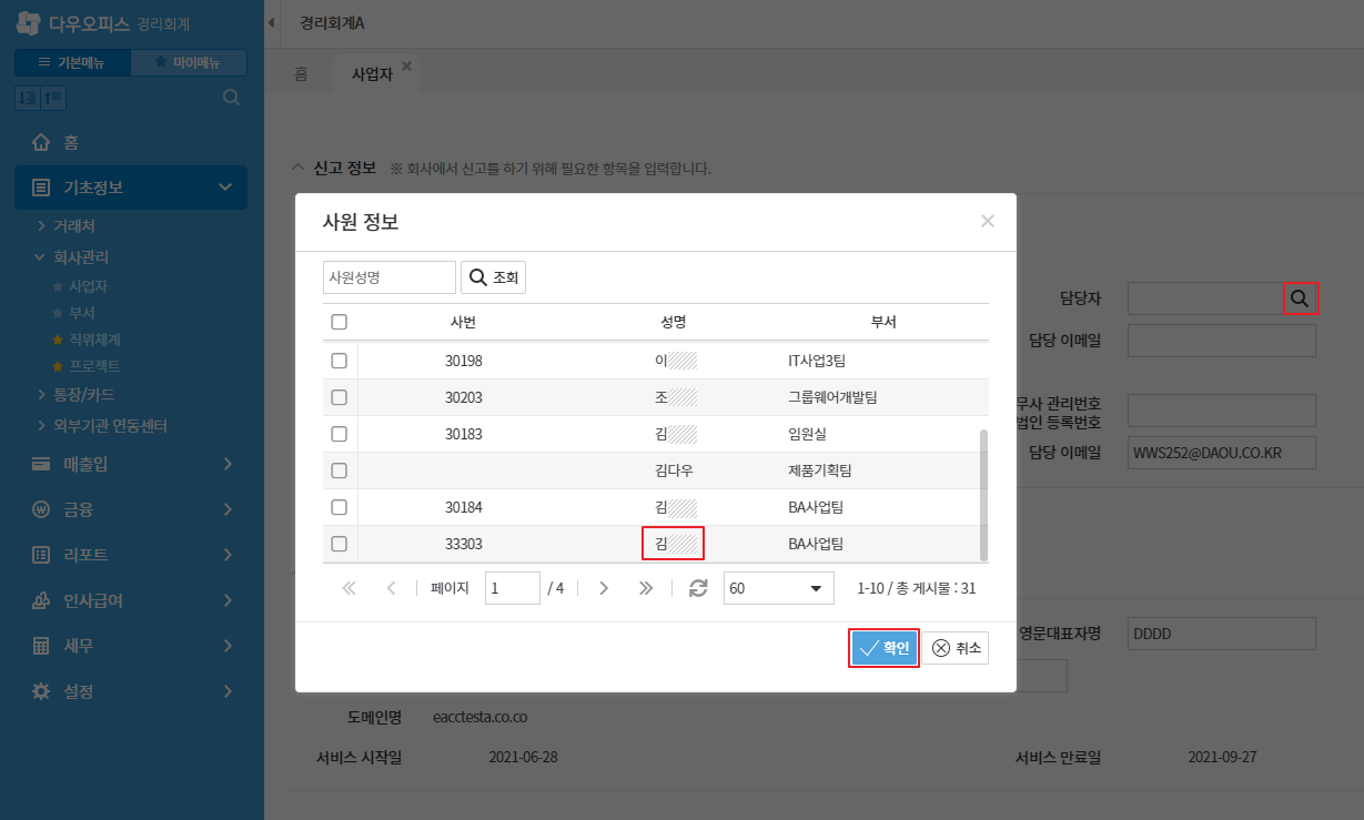 - 사원정보 검색(돋보기) 버튼을 클릭하여 담당자를 선택 후 확인 버튼을 클릭합니다.