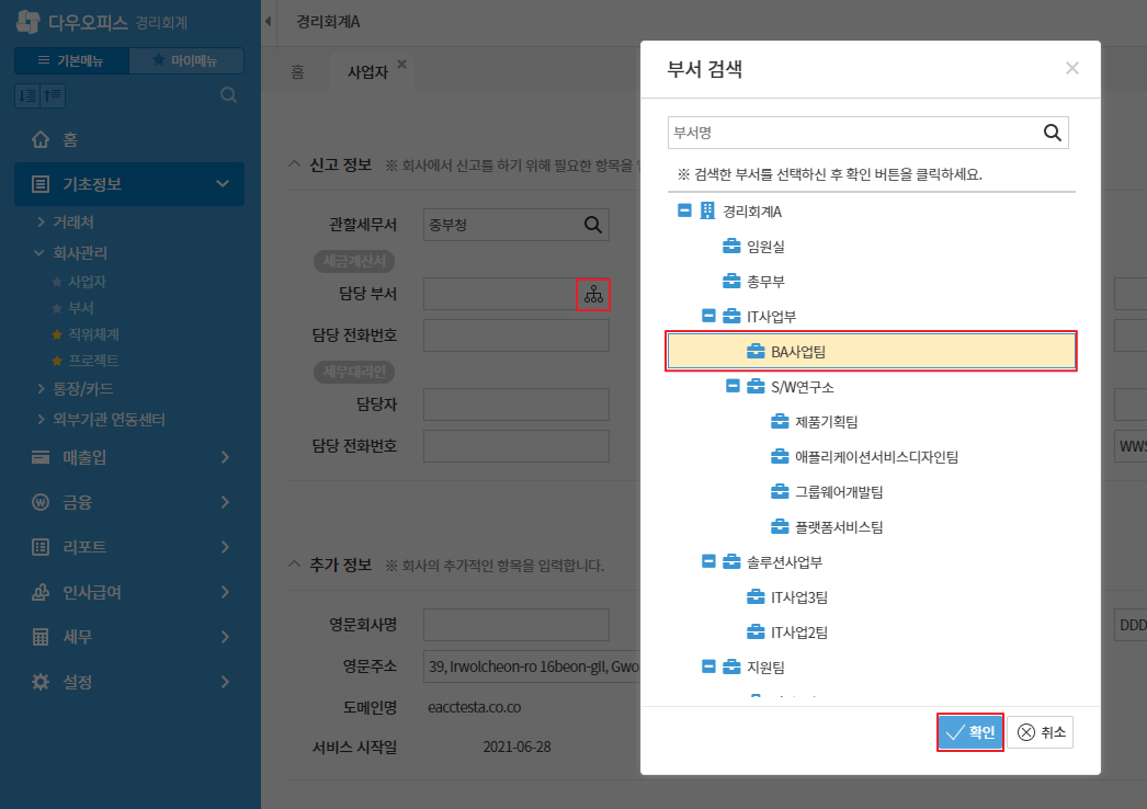 - 조직도(부서 검색) 버튼 클릭하여 담당부서 선택 후 [확인] 버튼을 클릭합니다.