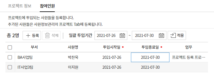 3. 참여인원 탭에서 프로젝트 인원 관리