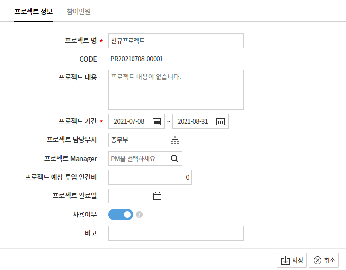 2. 프로젝트명, 기간 등을 입력 후 [저장]