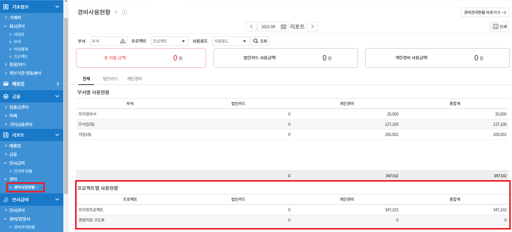 프로젝트별 경비사용 현황은 리포트 > 경비사용현황 메뉴에서 제공합니다.경비처리시 본인이 속한 프로젝트를 지정하여 처리하면 프로젝트별로 사용한 경비현황을 구분하여 조회할 수 있습니다.