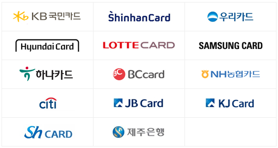 1. KB국민카드2. 신한카드3. 우리카드4. 현대카드5. 롯데카드6. 삼성카드7. 하나카드8. BC카드9. 농협카드10. 씨티카드11. JB카드(전북은행)12. KJ카드(광주은행)13. SH카드(수협)14. 제주은행카드