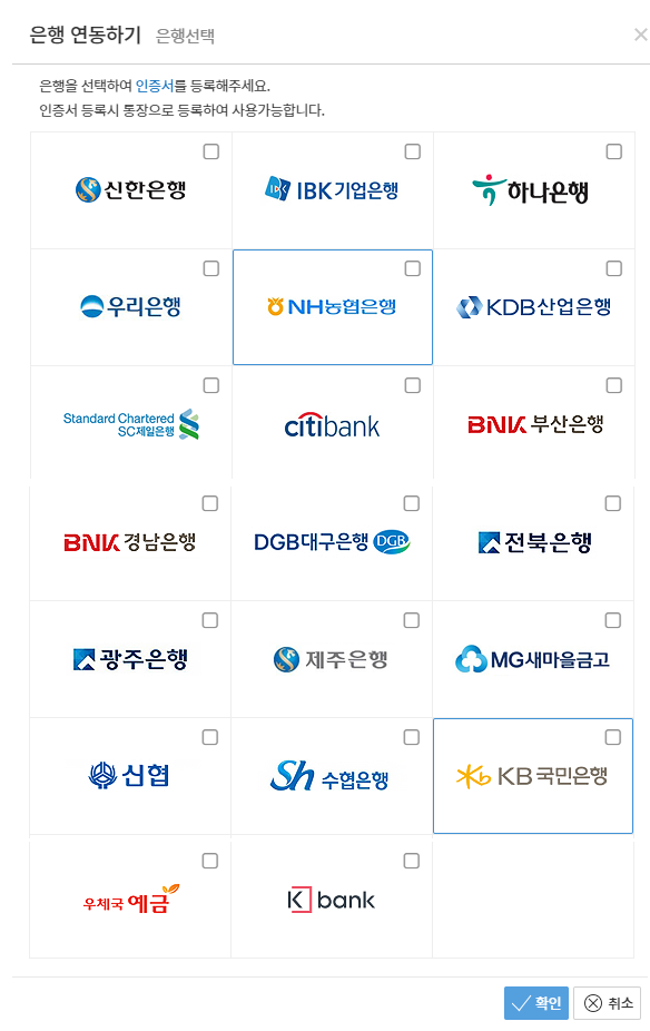 경리회계 서비스와 연동 가능한 은행은 20곳으로 아래와 같습니다.