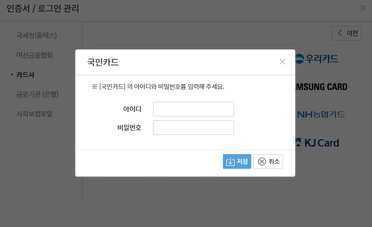 1. 인증서/로그인관리 메뉴에서 카드사 항목으로 이동하여 사용중인 법인카드의 카드사를 선택