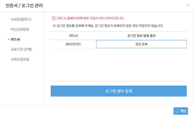 3. 카드사 로그인정보 정상 등록 확인 후 [확인] 선택