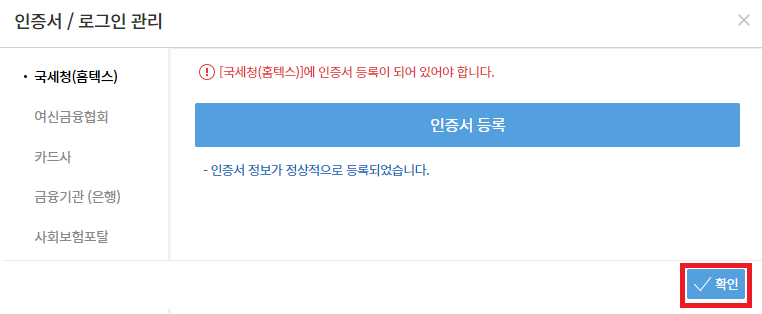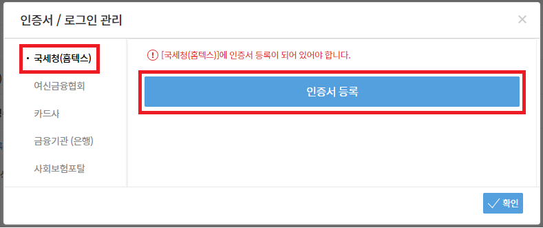 경리회계에 인증서 등록하기 전 홈텍스 사업자 회원가입 및 인증서 등록이 먼저 되어야 합니다.