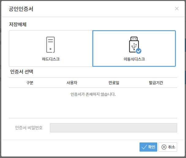 3. 공인인증서 선택 후 인증서비밀번호 입력 후 [확인]