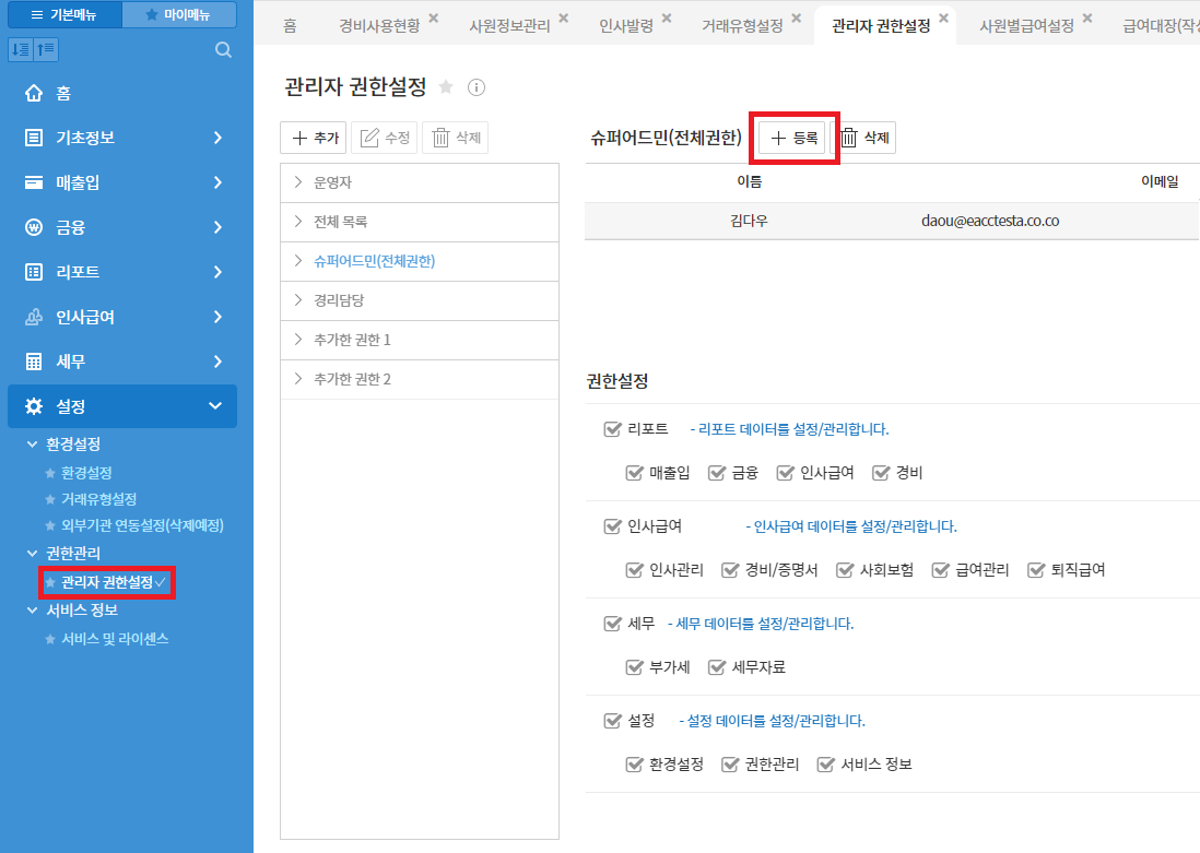 경리회계 서비스의 관리자 권한을 부여하는 방법 안내입니다.
