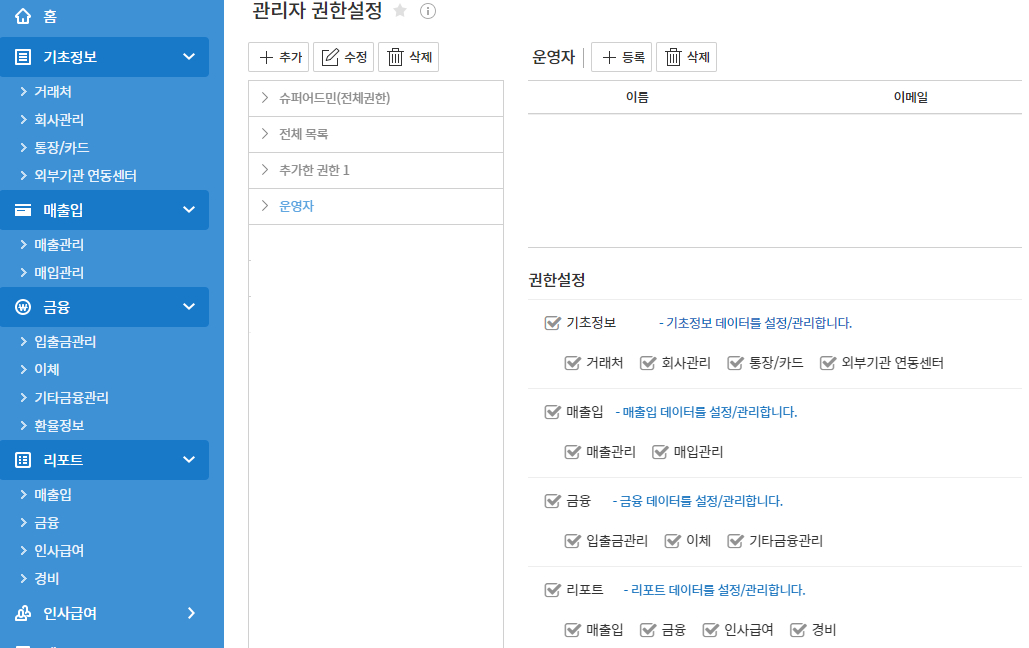 경리회계 서비스의 메뉴별 권한 설정 기준에 대한 안내입니다.