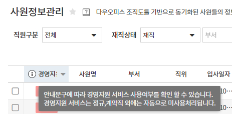 [인사급여] > [인사관리] > [사원정보관리]의 사원별 직원구분이 [정규/계약]인 사원만 경영지원 서비스로 접근할 수 있습니다.