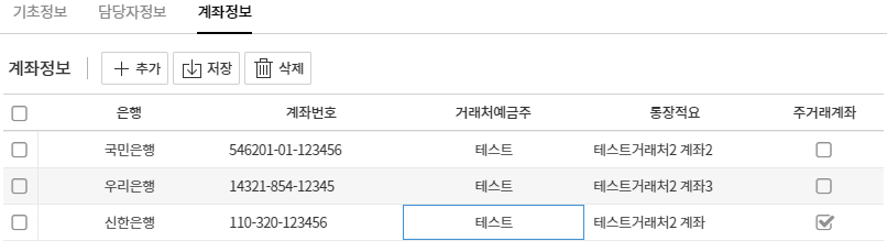 거래처의 거래계좌를 여러개 등록하여 관리할 수 있습니다.