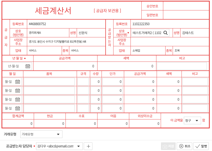 매출관리 > 전자세금계산서발행에서 공급받는자 담당자로 선택됩니다.