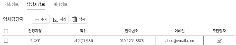 거래처관리 > 담당자정보에서 주담당자로 선택된 정보가
