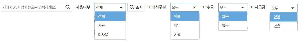 1. 엑셀로 다운로드하고자 하는 거래처 검색 조건을 선택합니다.