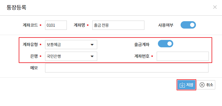 필수 입력 사항(계좌유형,은행,계좌번호)을 입력 후 내용을 저장합니다.