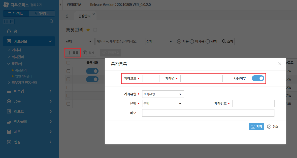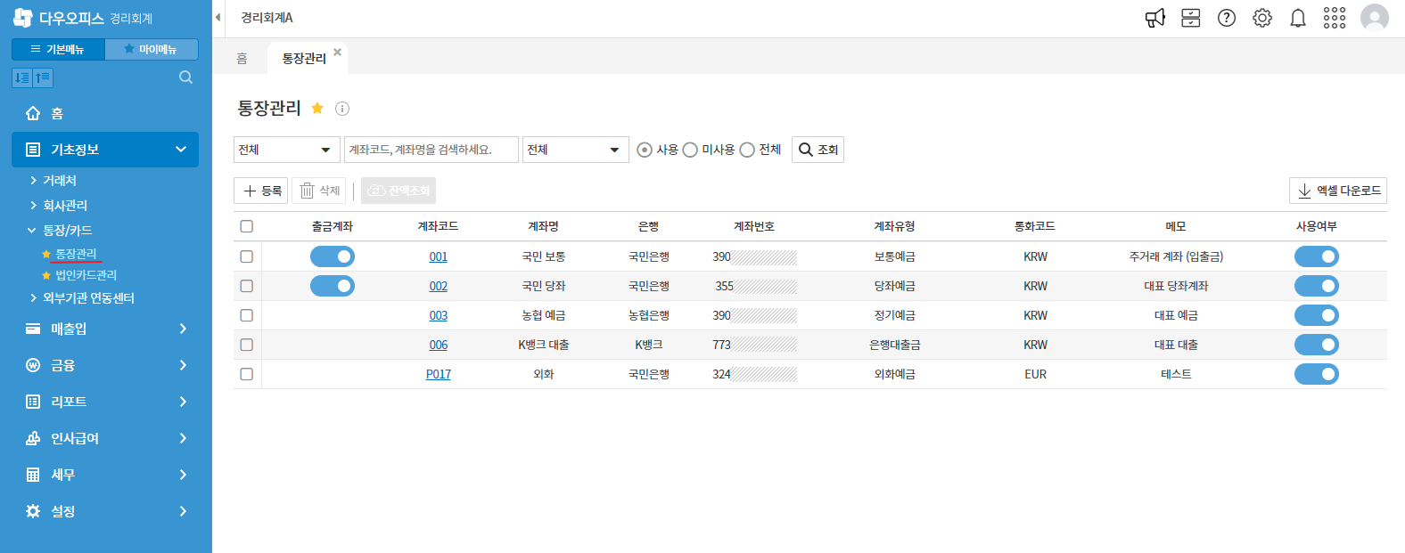 등록 버튼을 클릭하여 사용중인 통장의 확인 정보 및 사용여부를 선택합니다. (계좌코드,계좌명,사용여부)