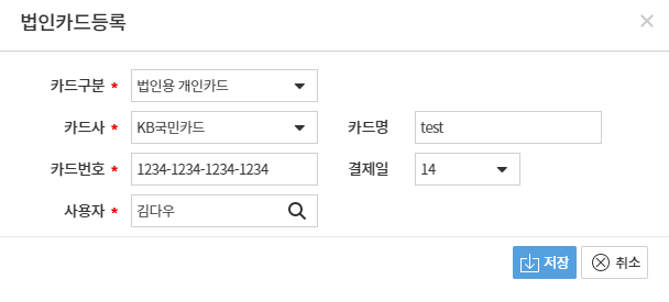 1. 법인카드 등록시 카드번호 유효성 체크가 진행되며, 카드번호가 유효하지 않을 경우 등록되지 않습니다.