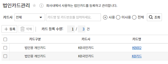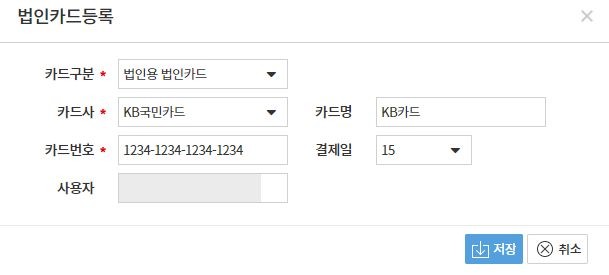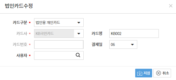 메뉴위치 : 기초정보 > 통장/카드 > 법인카드관리
