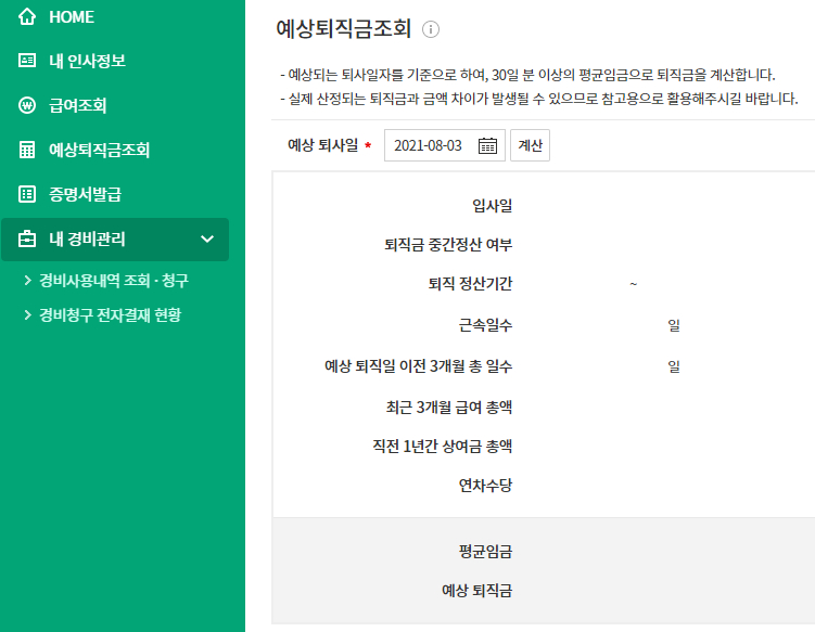 경리회계에 등록된 사원정보와 급여계산 정보를 기준으로 예상퇴직일의 퇴직금을 조회하는 기능을 제공합니다. 현재의 급여정보를 기반으로한 예상퇴직금으로 실제 수령하게될 퇴직금과는 차이가 발생할 수 있습니다. 퇴직금 참고용으로 활용하시면 됩니다.