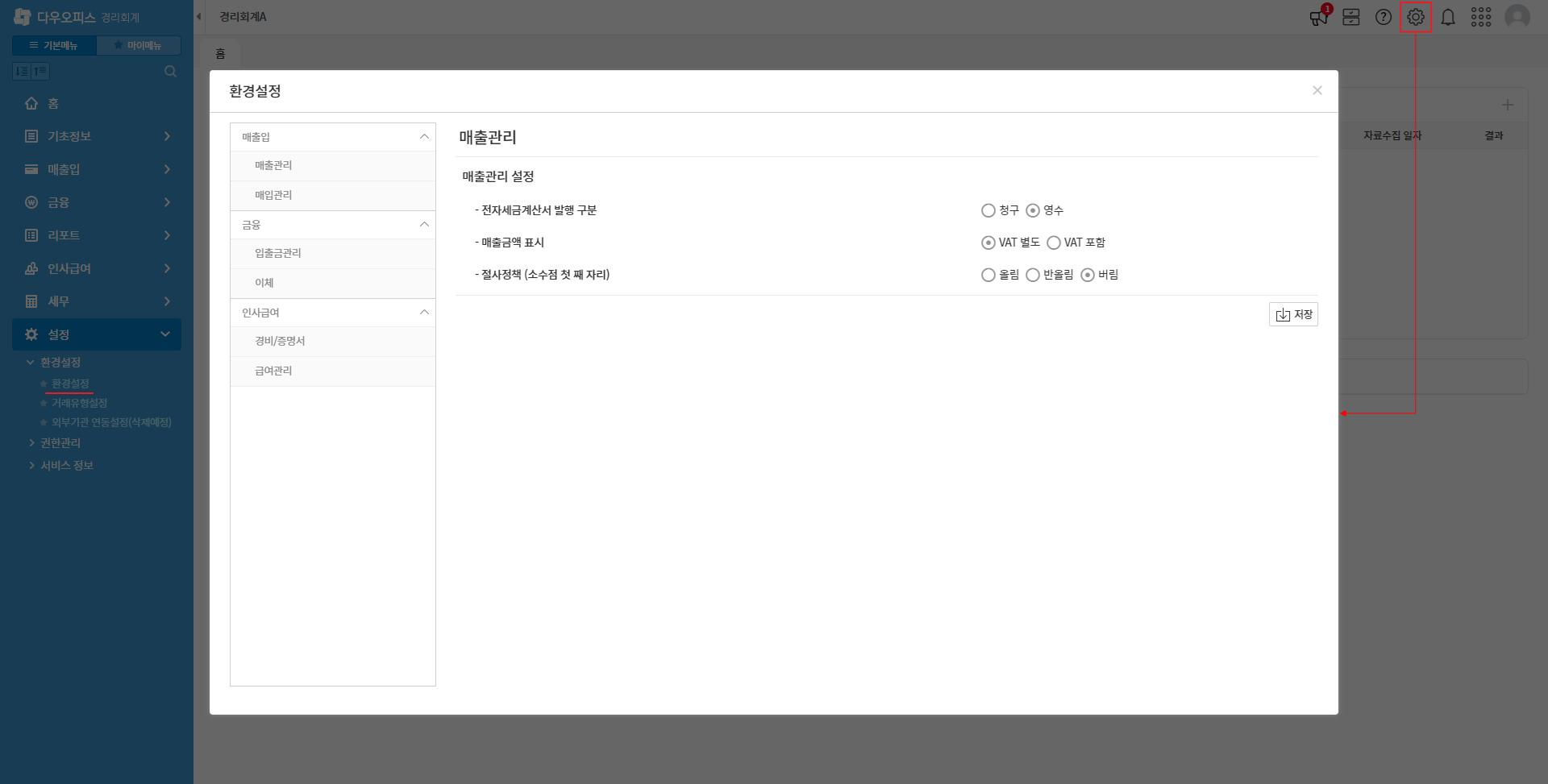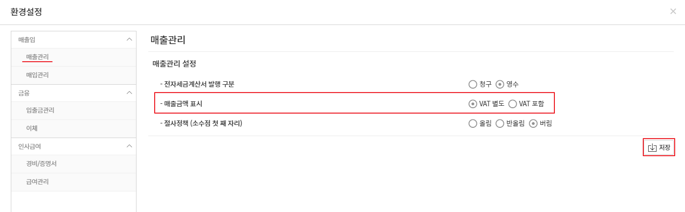 - 매출금액에 대한 부가세 포함 여부를 설정 후 저장합니다.