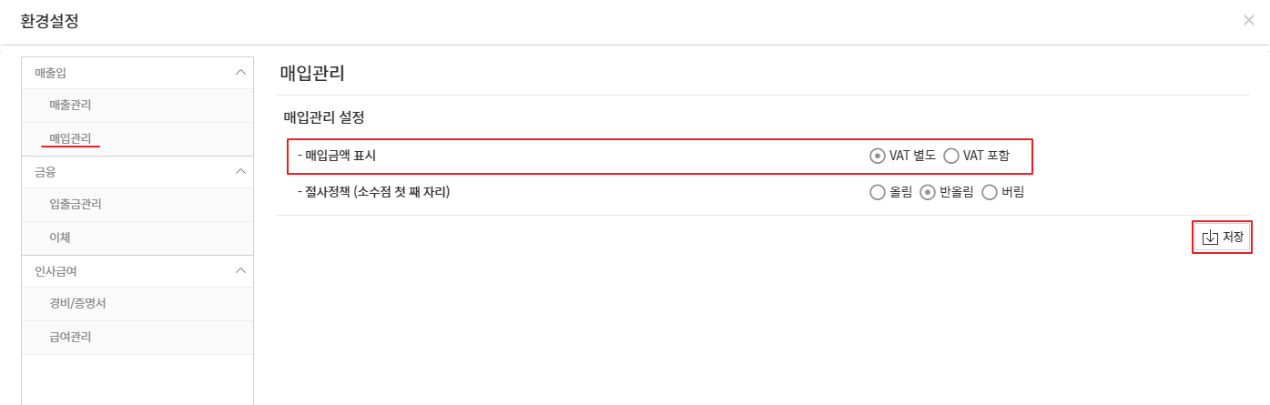 - 매입금액에 대한 부가세 포함 여부를 설정 후 저장합니다.