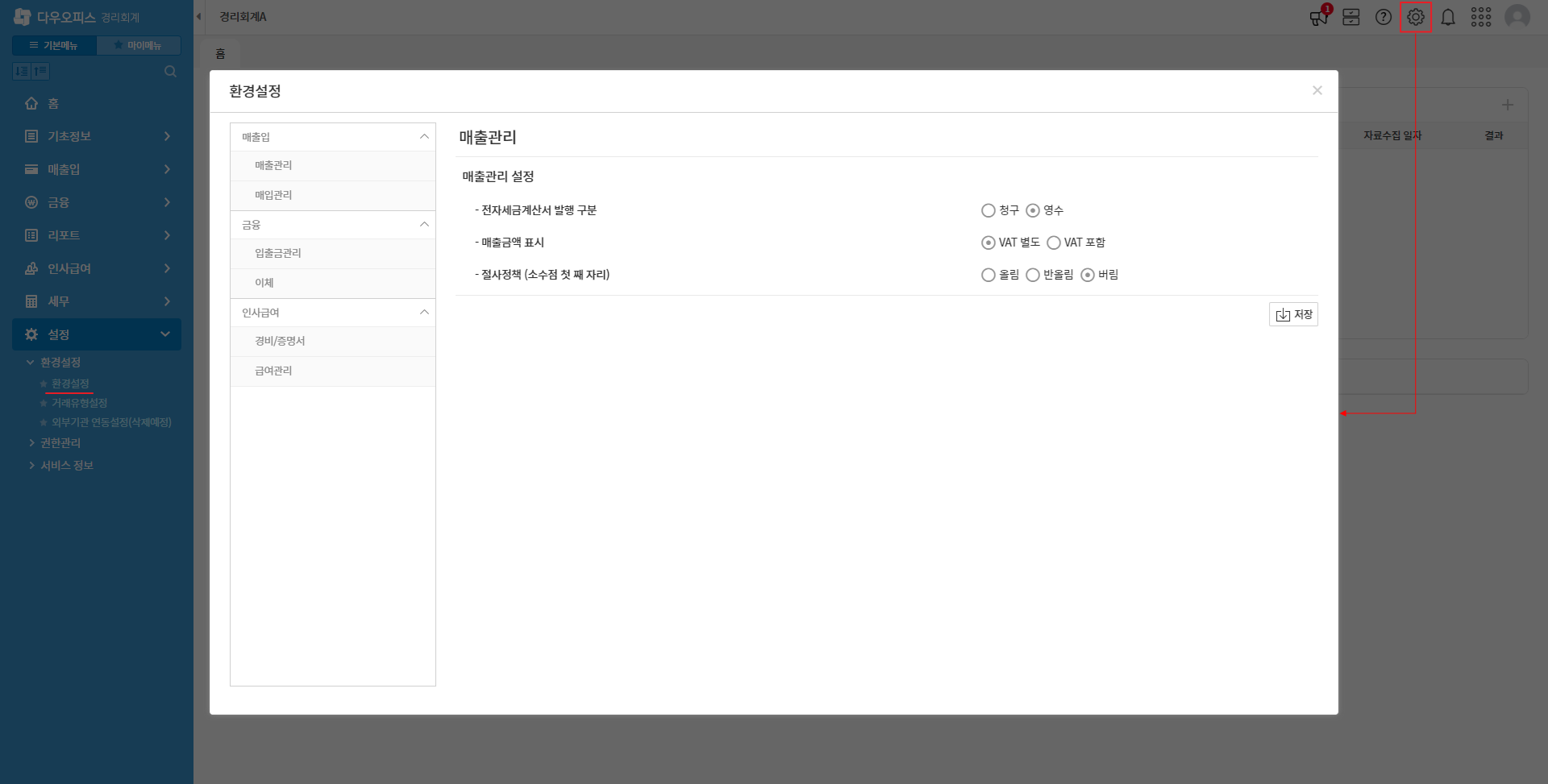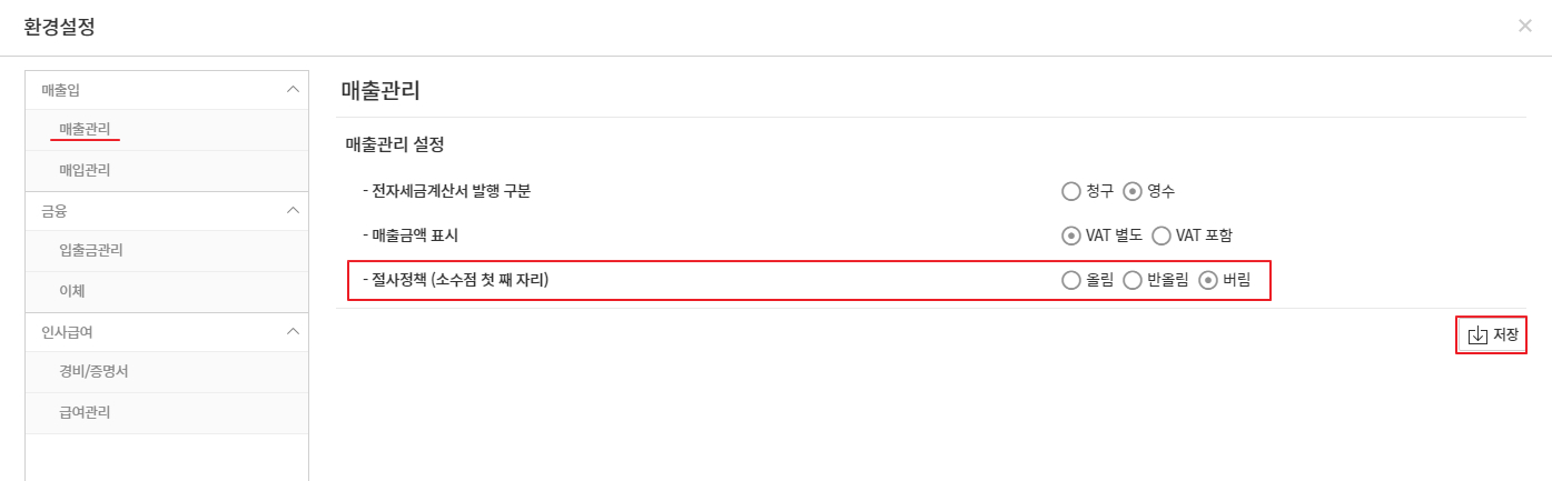 - 매출금액에 대한 소수점이하 원단위에 대한 절사정책을 설정 후 저장합니다.