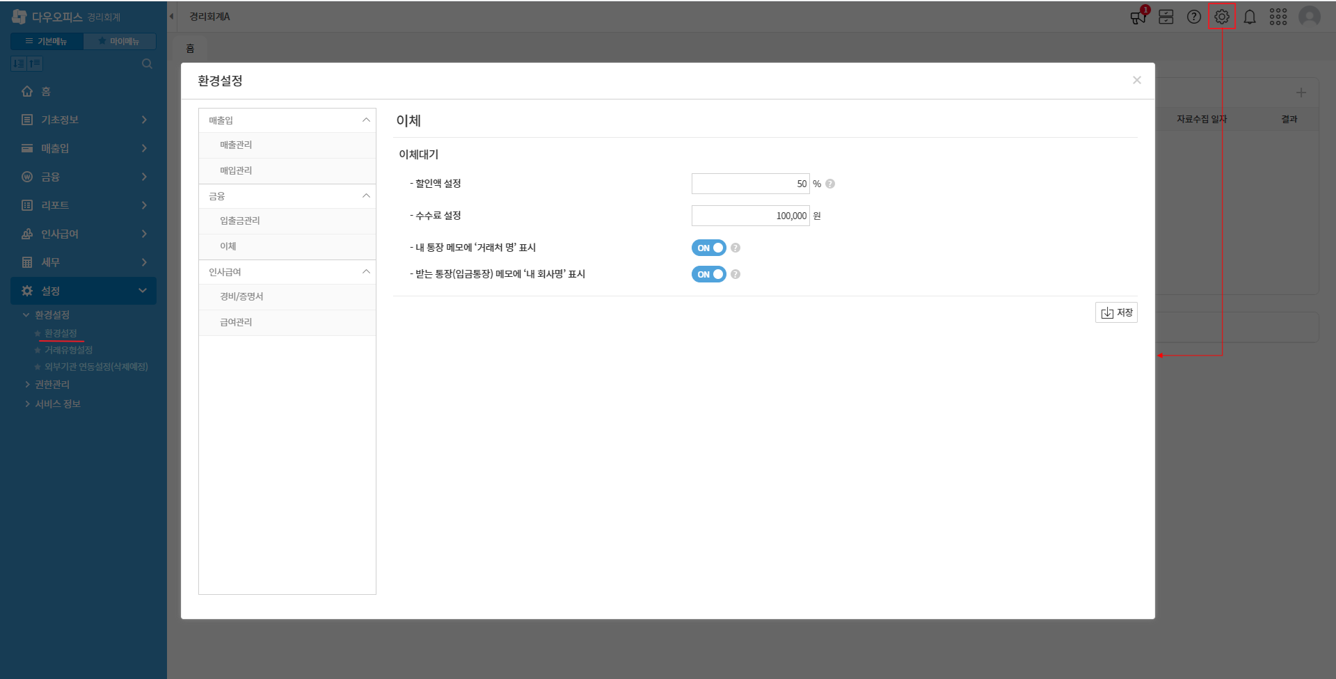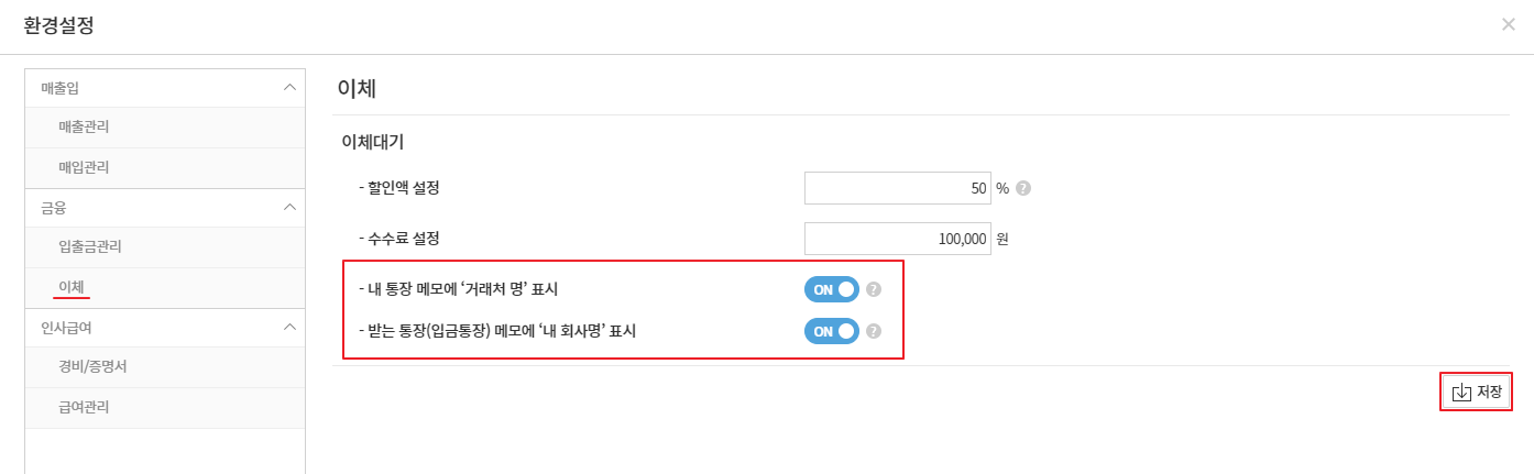 1. [금융 > 이체] 메뉴로 이동- 이체대기화면에서 거래처명,내회사명의 자동 표시 여부를 설정 후 저장합니다.