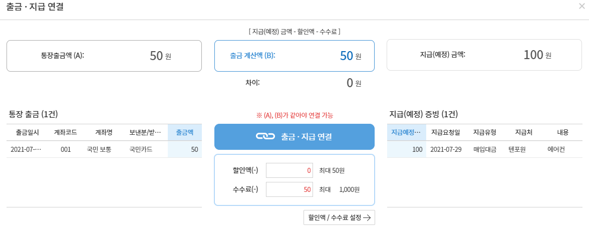 2. 통장입출금 메뉴에서 설정한 수수료 금액까지만 이체 수수료를 차감할 수 있습니다.
