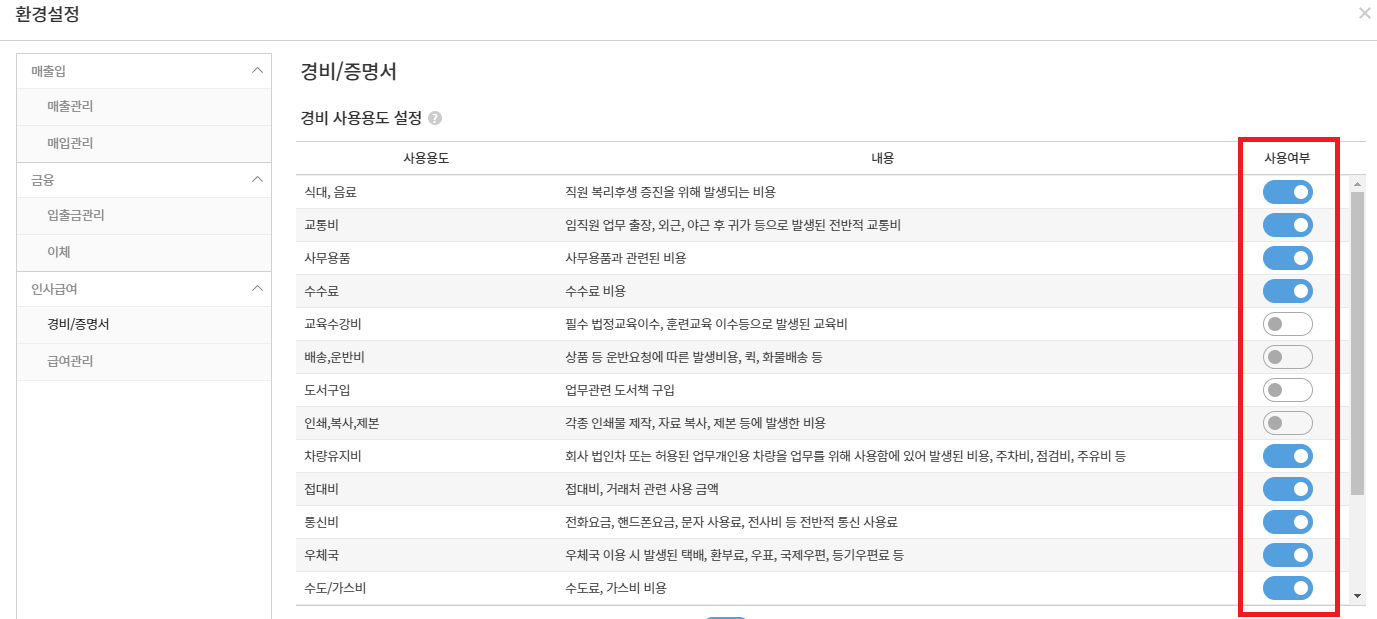 1. 경비 사용용도 설정에서 회사에서 허용할 용도만 활성화