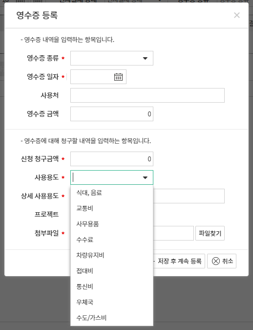경비처리에서 입력하는 사용용도 항목 등록 방법 안내입니다.