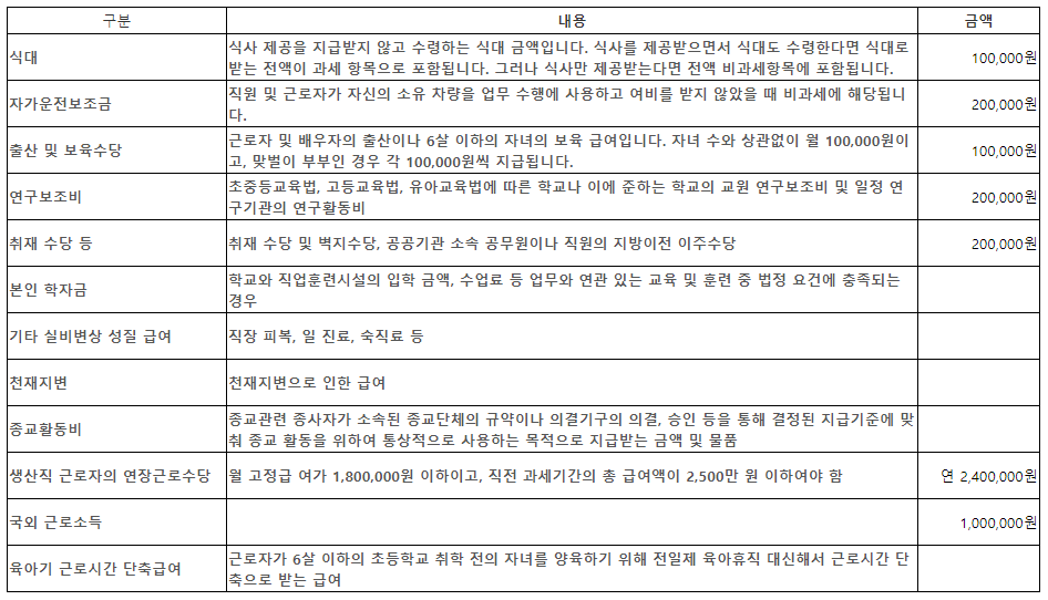 비과세로 지정가능한 지급항목은 아래와 같습니다.