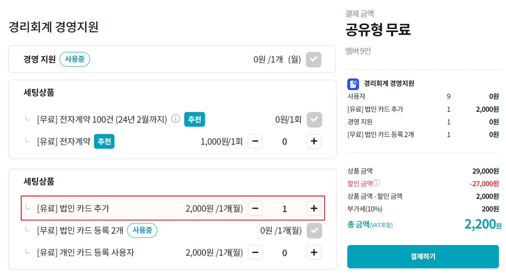 만약, 추가로 법인카드 등록하여 사용이 필요하신 경우 '고객포털'에서 법인카드 추가구매(장당 2,000/월)를 통하여 조회하실 수 있습니다.