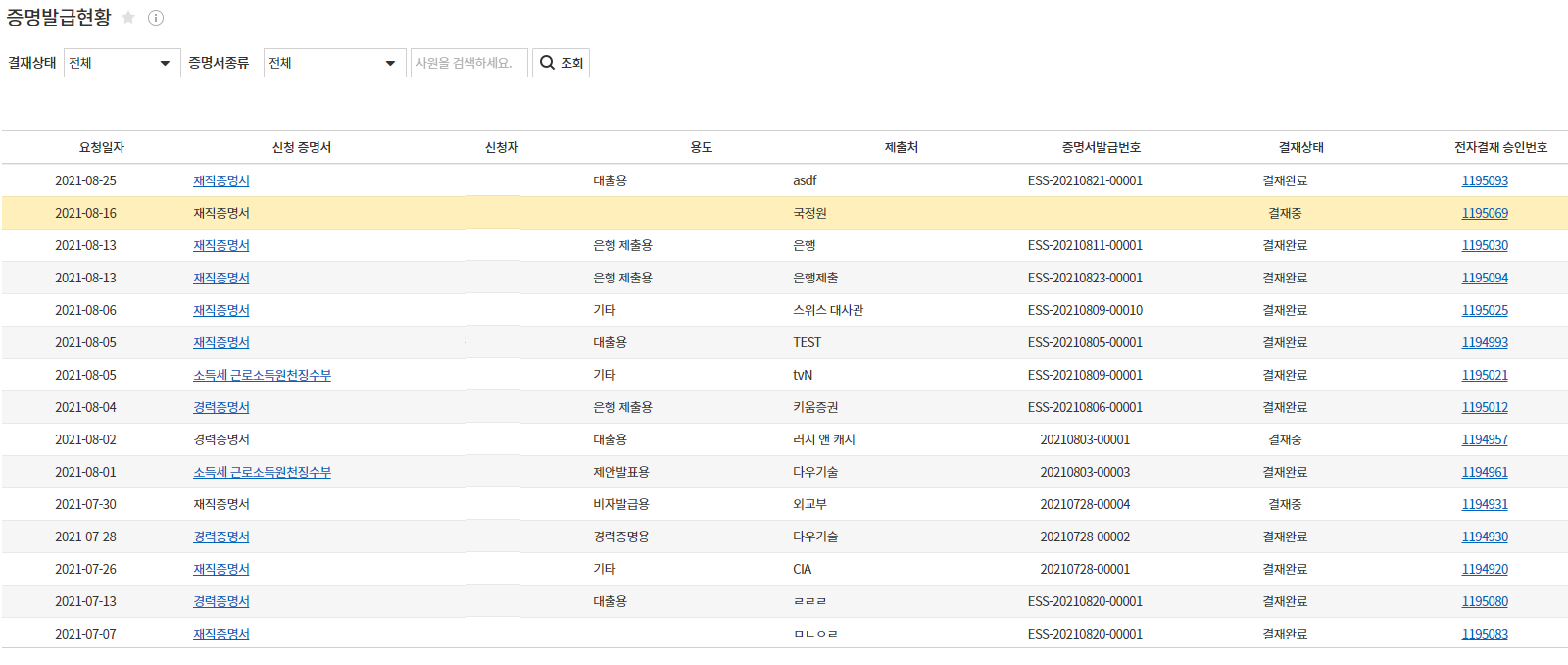 경리회계 관리자는 임직원의 증명서 발급현황을 확인할 수 있습니다.
