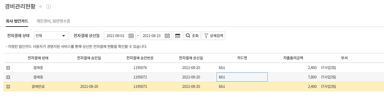 1. 회사 법인카드 탭에서 기간 선택 후 조회