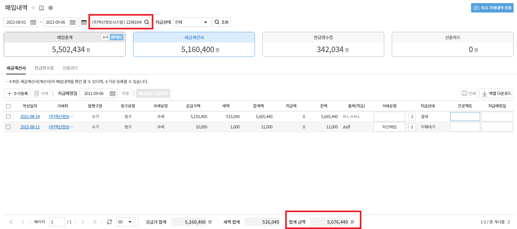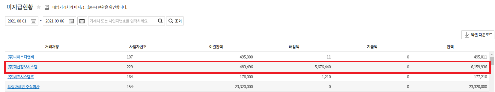 미지급현황에서 조회된 거래처별 상세내역은 매입내역에서 조회하실 수 있습니다.