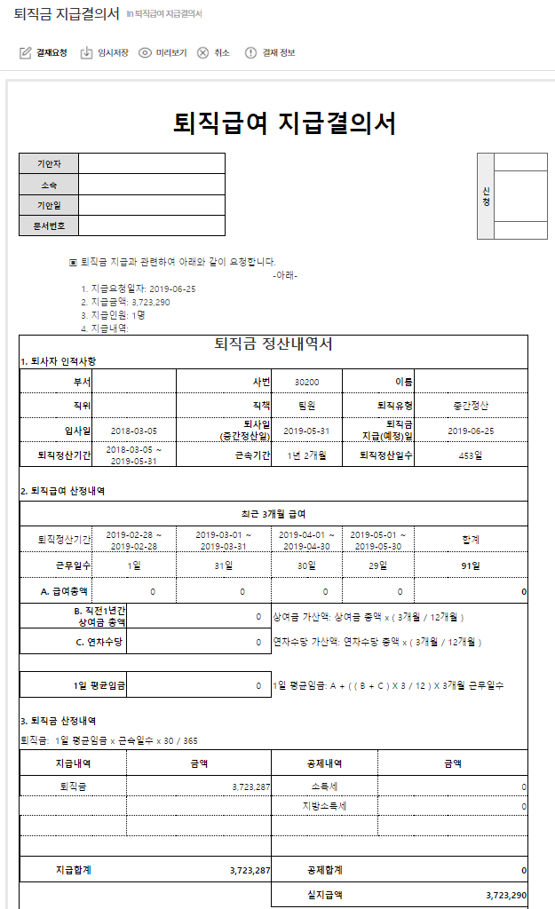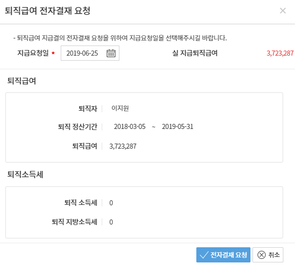 6. 퇴직금 중간정산 금액 확인 후 [전자결재 요청] 선택
