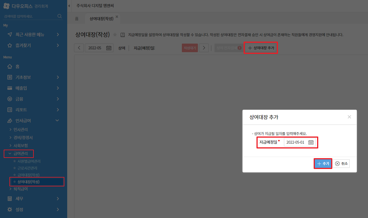 2. 상여대장 추가 팝업창에서 [지급예정일] 설정 > [+추가] 선택