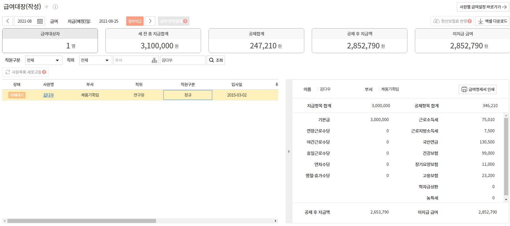 다우오피스에 등록된 직원 중 정규직, 계약직 직원의 급여계산 기능을 제공합니다.