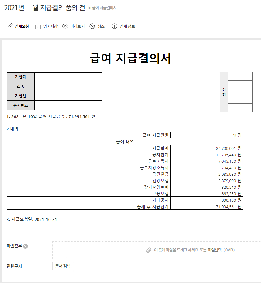 매월 사원별 급여대장 작성이 끝나면 급여대장 전자결재를 통해 내부 승인절차를 진행합니다.