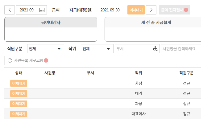 전자결재 승인이 완료된 급여는 이체대기로 자동등록되며, 손쉽게 직원별 급여 이체를 진행하실 수 있습니다.