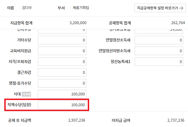 4. 수당지급 항목 확인 및 금액 입력