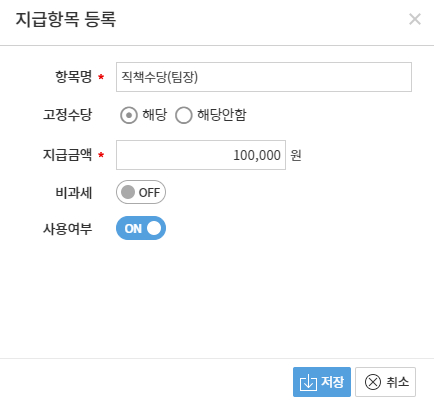 메뉴위치 : 설정 > 환경설정 > 인사급여 > 급여관리 > 지급항목(탭)