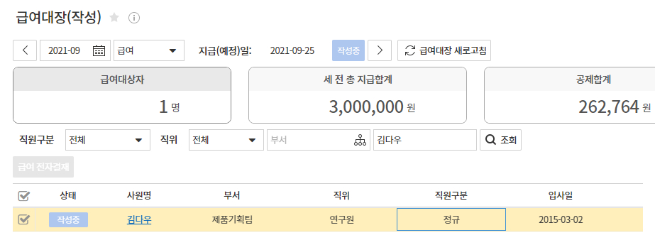 3. 급여대장(작성) 이동 후 고정수당 지급 대상자 선택