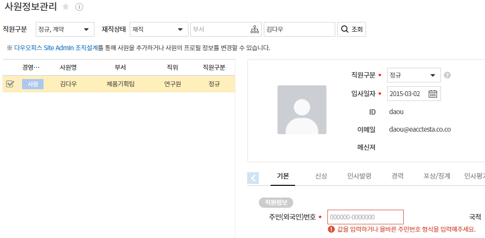 2. 기본 탭에서 [직원구분], [입사일자], [주민(외국인)번호] 입력