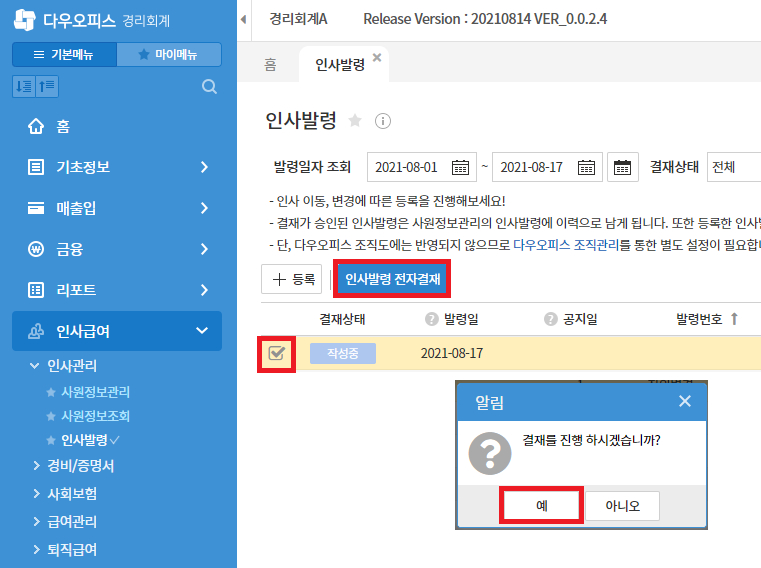 1. 경리회계 > 인사급여 > 인사관리 > 인사발령 메뉴에서 발령 정보 등록 후 전자결재 승인